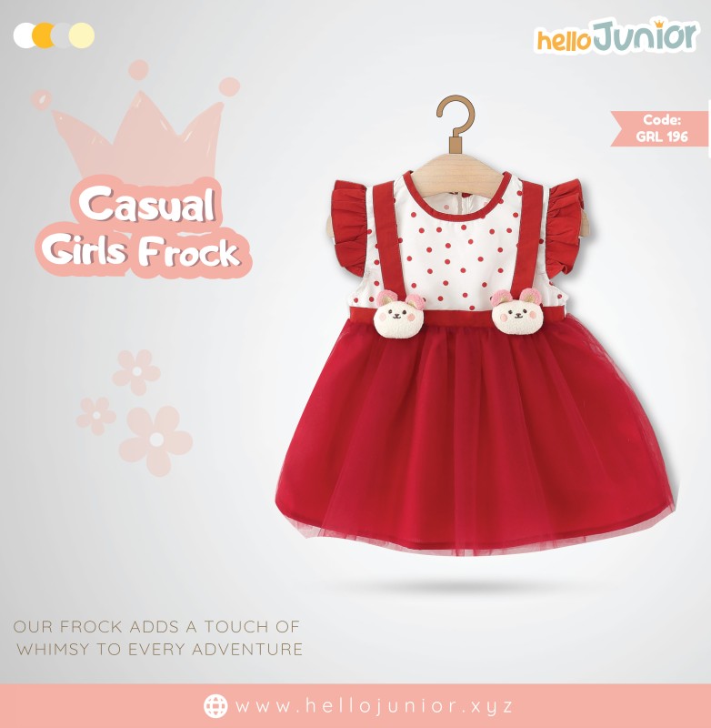 Hello Junior Casual Girls Frock (6 Months to 3 Years) Material: Cotton silky interior, silky exterior Design: Stylish and comfortable for casual wear Size Range: 6 months to 04 years Features: Soft, breathable, and gentle on skin Dress your little girl in comfort and elegance with Hello Junior's casual frock!