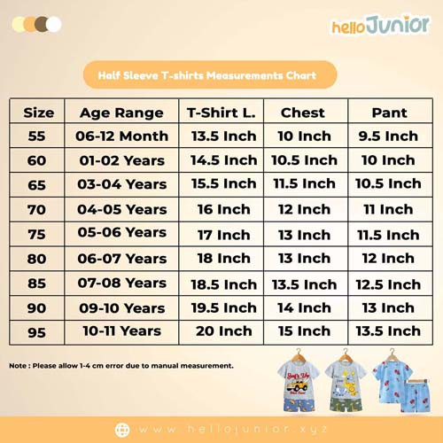 Hello Junior Half Sleeve T-Shirt for Kids (6 Months to 11 Years) Material: Soft, breathable fabric Design: Trendy Half Sleeve style Size Range: 6 months to 11 years Features: Comfortable fit, easy to wear, durable Keep your kids stylish and comfy with Hello Junior Half Sleeve T-Shirt!
