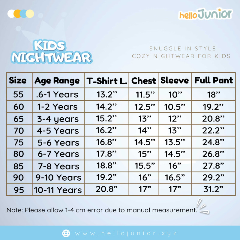Material: 95% cotton, 5% spandex for softness and stretch Design: Comfortable and cozy nightwear Size Range: 6 months to 11 years Features: Breathable, stretchy, and easy to wear Ensure a peaceful night's sleep with Hello Junior's comfortable and stylish nightwear!