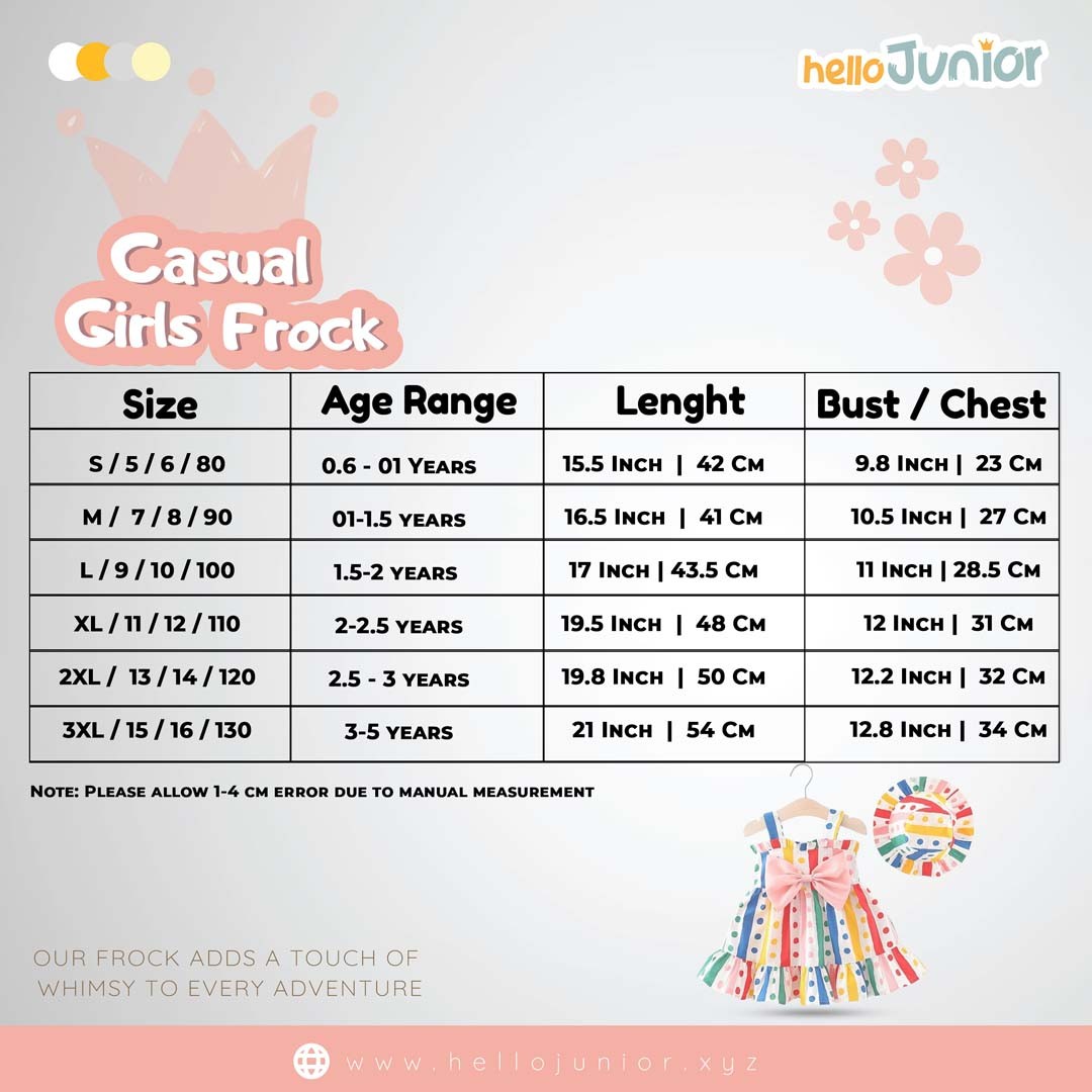 Hello Junior Casual Girls Frock (6 Months to 3 Years) Material: Cotton silky interior, silky exterior Design: Stylish and comfortable for casual wear Size Range: 6 months to 04 years Features: Soft, breathable, and gentle on skin Dress your little girl in comfort and elegance with Hello Junior's casual frock!